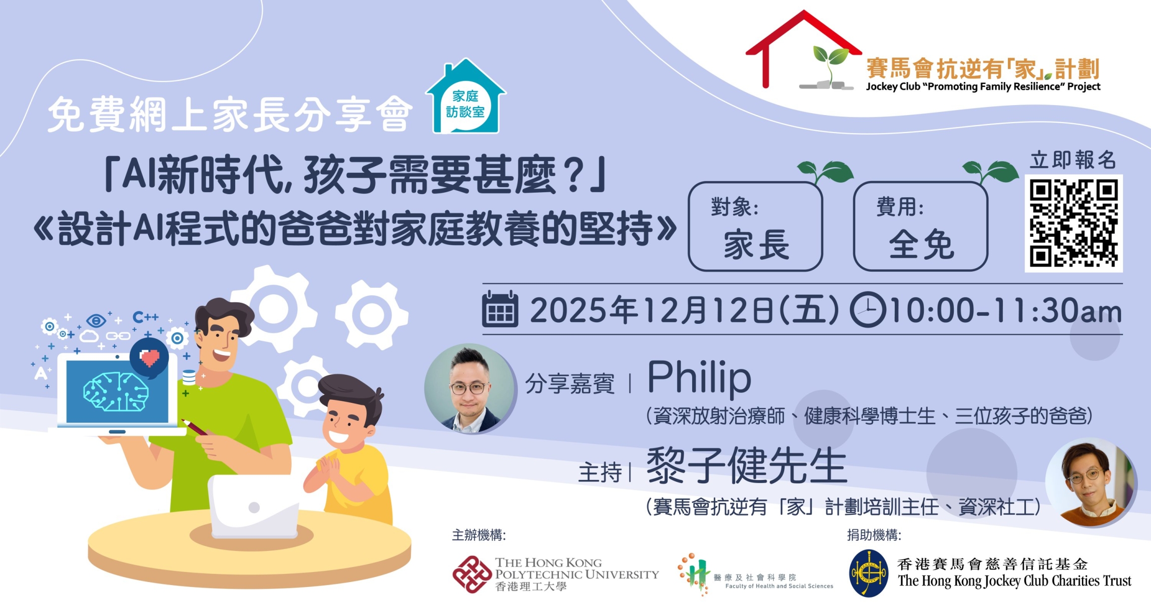 為幫助家長理解AI對孩子學習的影響,培養孩子有效利用科技解決問題,促進親子溝通,賽馬會抗逆有「家」計劃即將舉辦一場免費網上家長分享會,邀請了資深放射治療師與三個孩子的父親Philip,與家長們一同思考,在AI新時代下,孩子真正需要的是甚麼。詳情請參閱附件海報,歡迎家長踴躍參與。