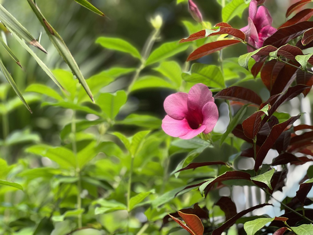 為常綠蔓性藤本植物,莖、葉面及葉背之葉脈密生絨毛,有白色乳汁;葉橢圓至倒卵形,葉端突尖,全緣,徑枝和葉背的羽脈密生毛茸;花冠漏斗形,淡紫紅色,冠喉顏色較深。春末至秋季開花,花期可以長達數月。