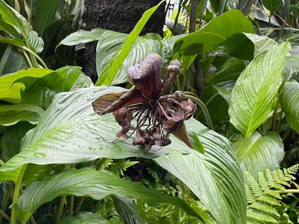 又名老虎鬚,是一種觀賞性植物,主要分佈在中南亞地區,適宜在温暖的氣候下生長。由於花型的獨特,被稱為幽靈般的植物,也在馬來西亞被視為「不吉祥」的花卉,它們晃來晃去的果實看起來就像是倒掛着的蝙蝠一樣。