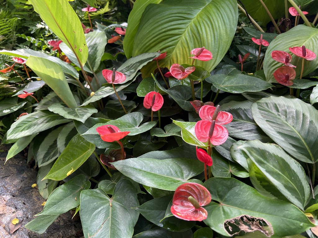 又名紅掌、花燭。火鶴花的「花」,由花梗、苞片及肉穗花序組成,真正的「花」並不明顯。火鶴花花期長,花朵亮麗,形、色豐富多彩,無論切花、盆栽或是庭院栽培均適宜,普受消費者喜愛。